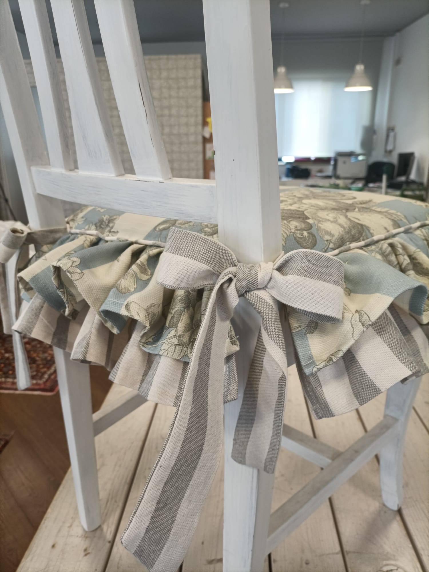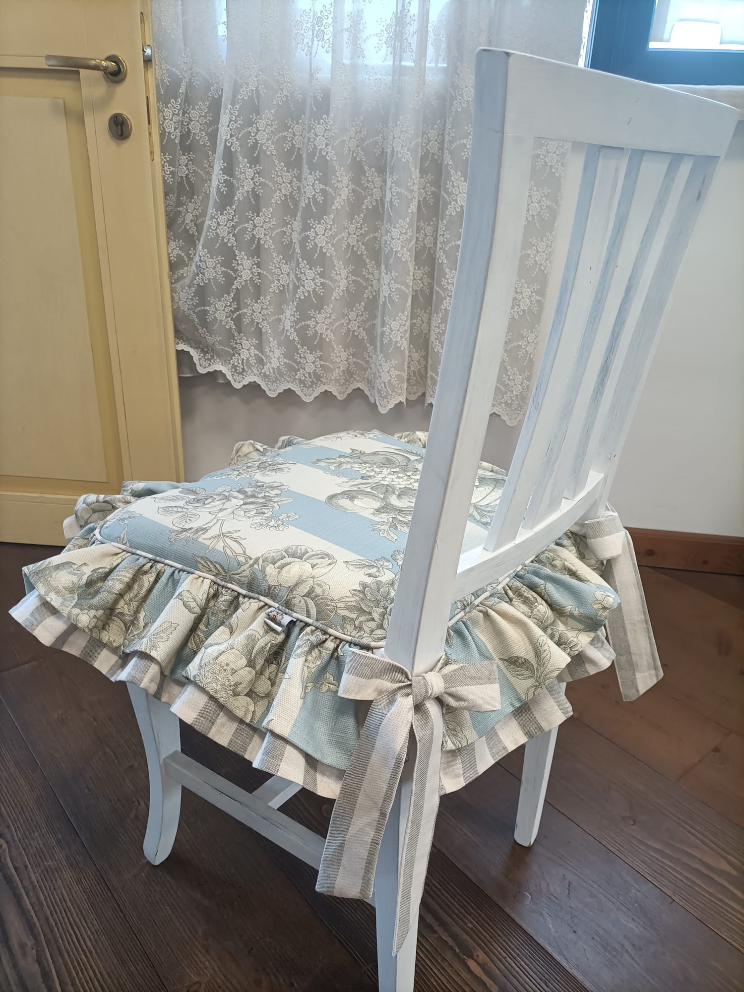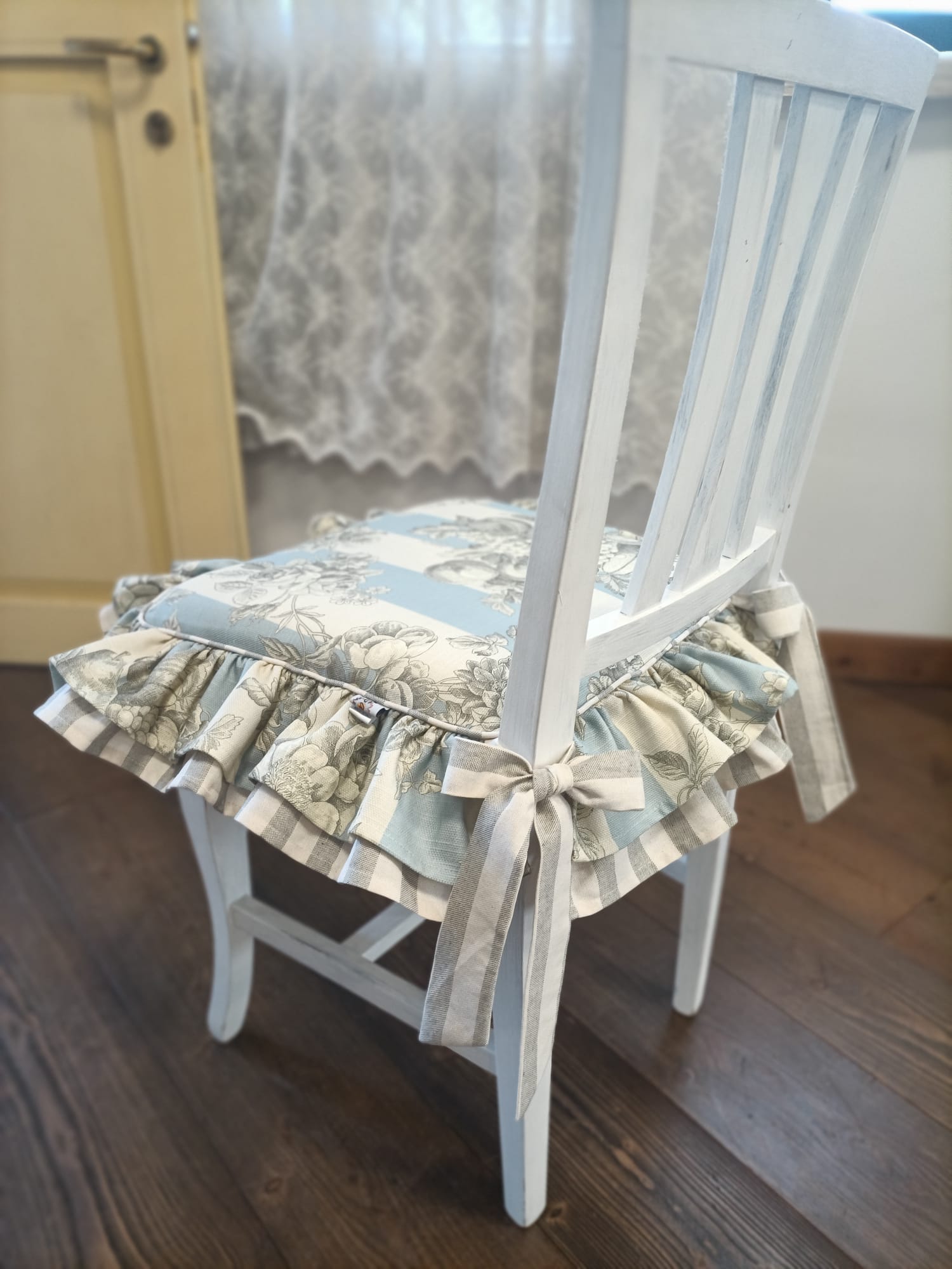 Cuscino per sedia sagomato sfoderabile con doppia balza, lacci coordinati di grande effetto. Tessuto di cotone lavabile in acqua 30°. I colori sono solidi e resistenti all'usura e al tempo.