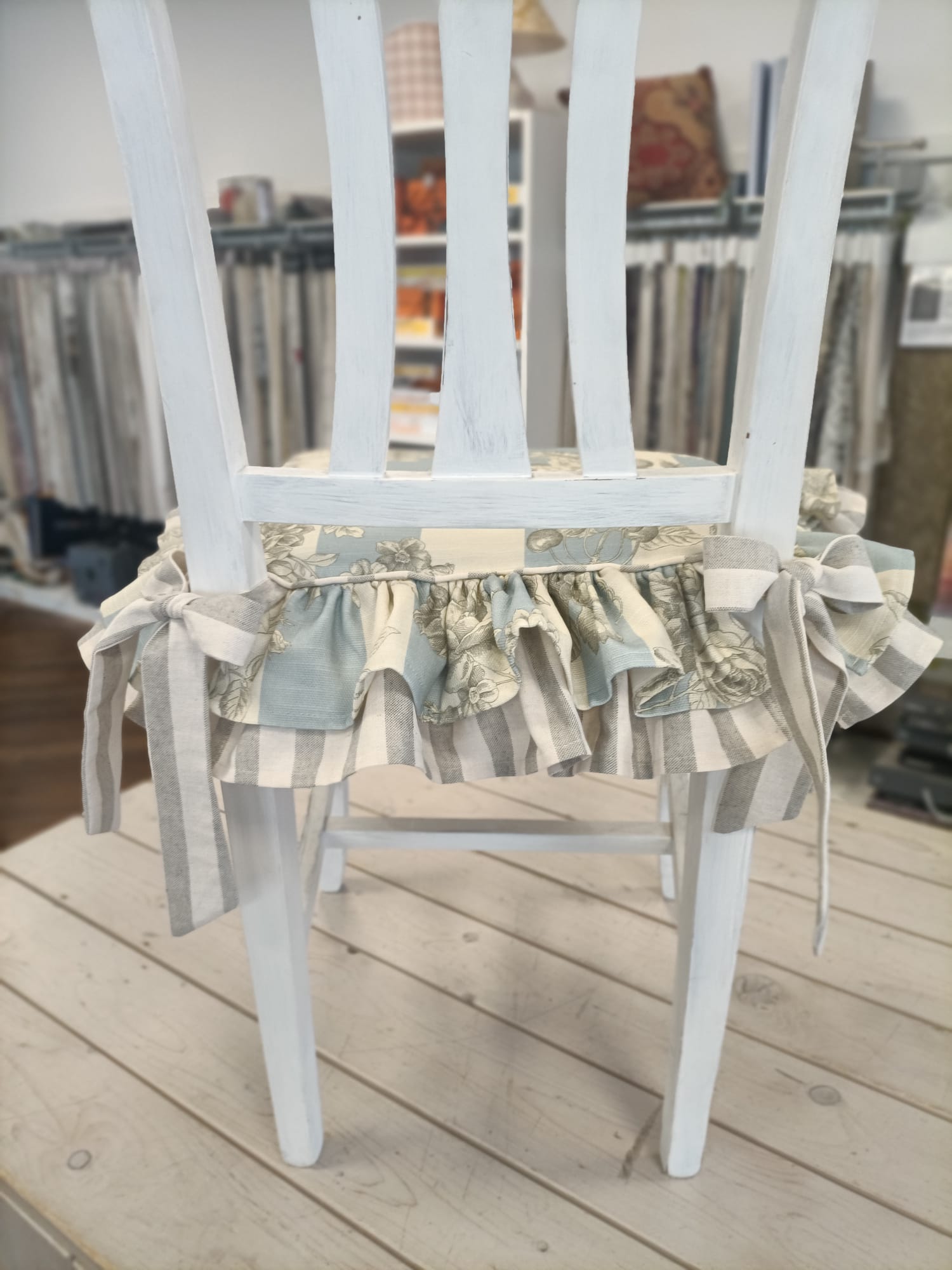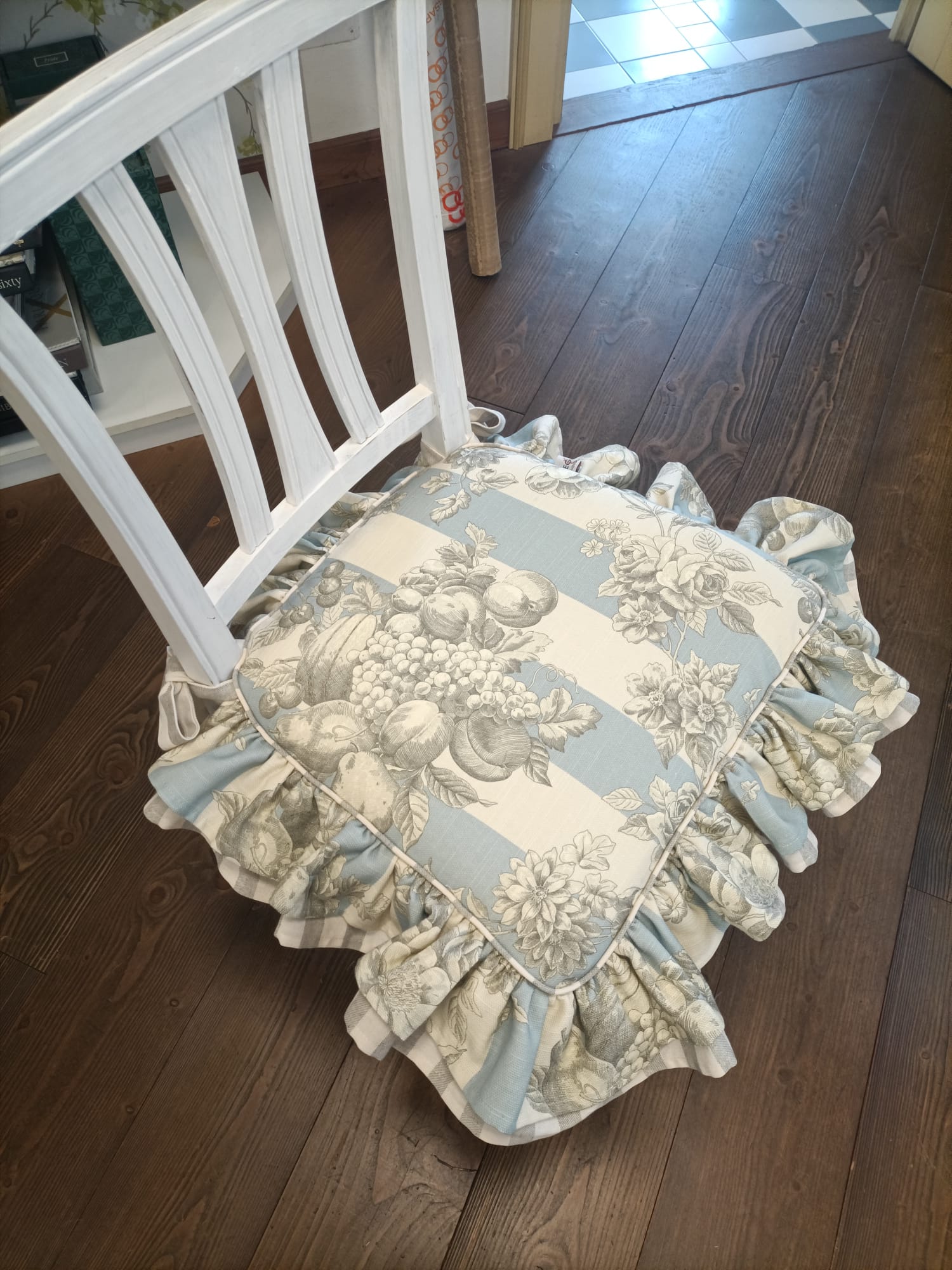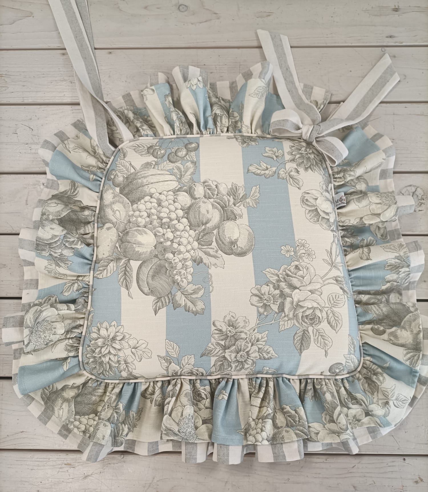 Cuscino per sedia sagomato sfoderabile con doppia balza, lacci coordinati di grande effetto. Tessuto di cotone lavabile in acqua 30°. I colori sono solidi e resistenti all'usura e al tempo.