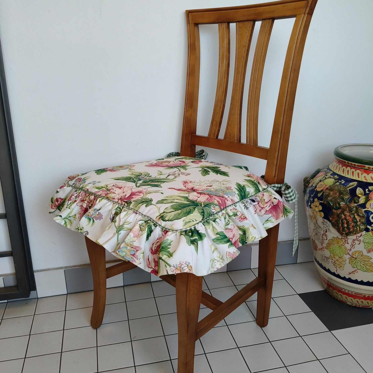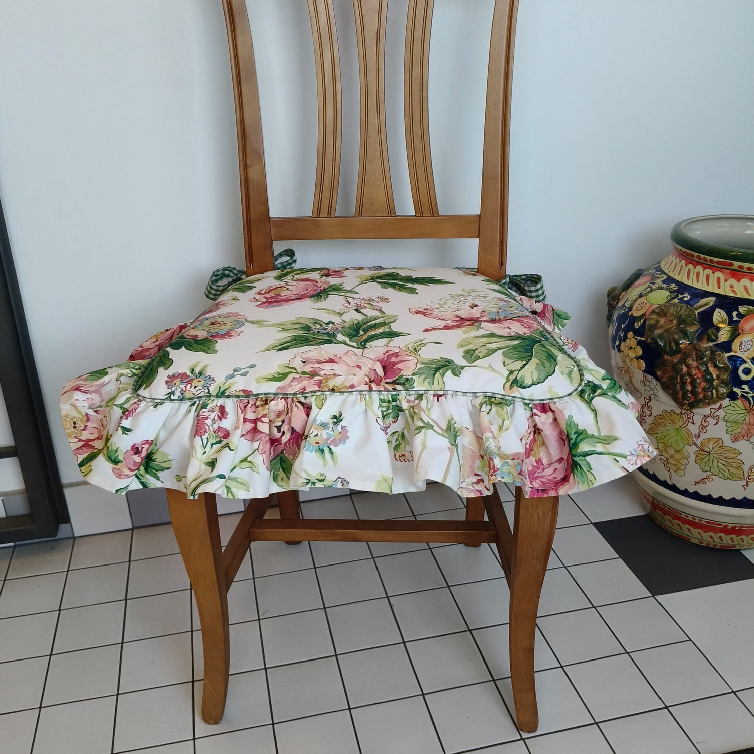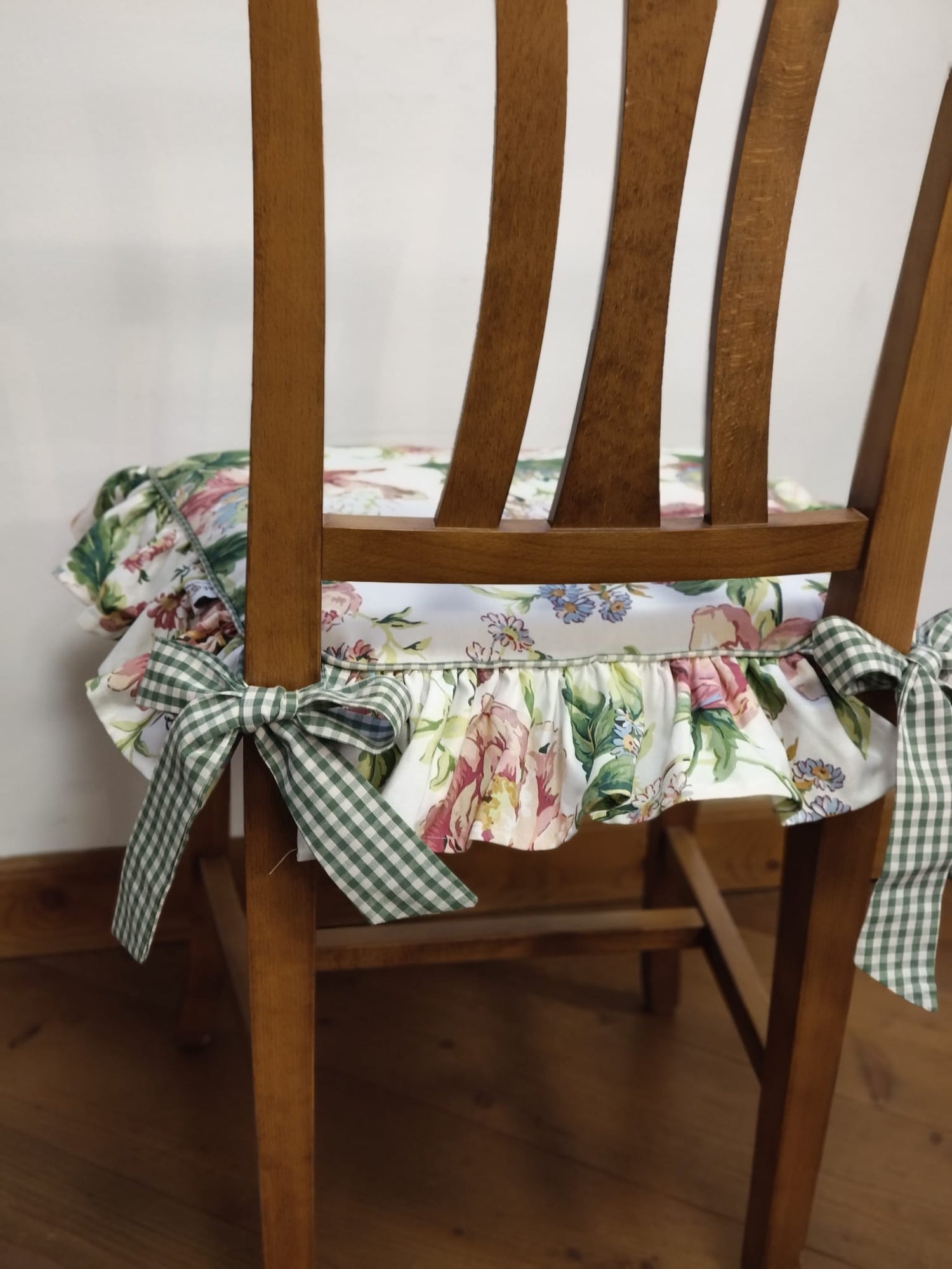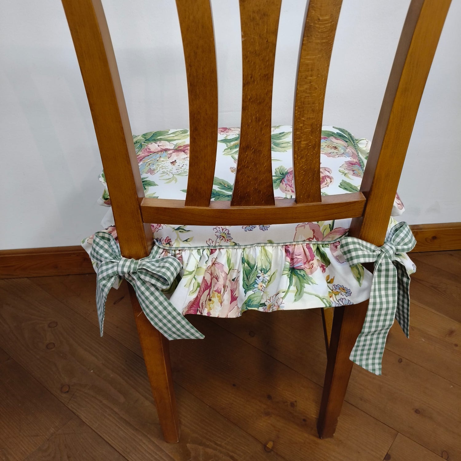 Cuscino per sedia sagomato con una balza e lacci per fiocco, sfoderabile e di facile manutenzione. Adatto ad un contesto country e/o shabby. Una cucina che ha bisogno di luminosità e di una nota di freschezza