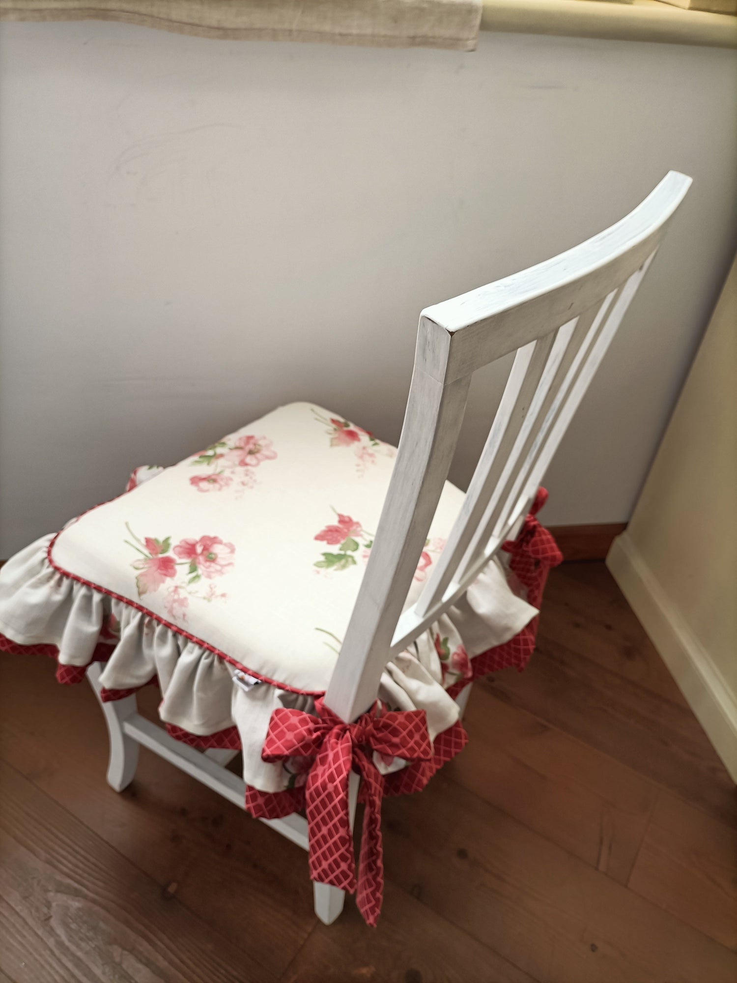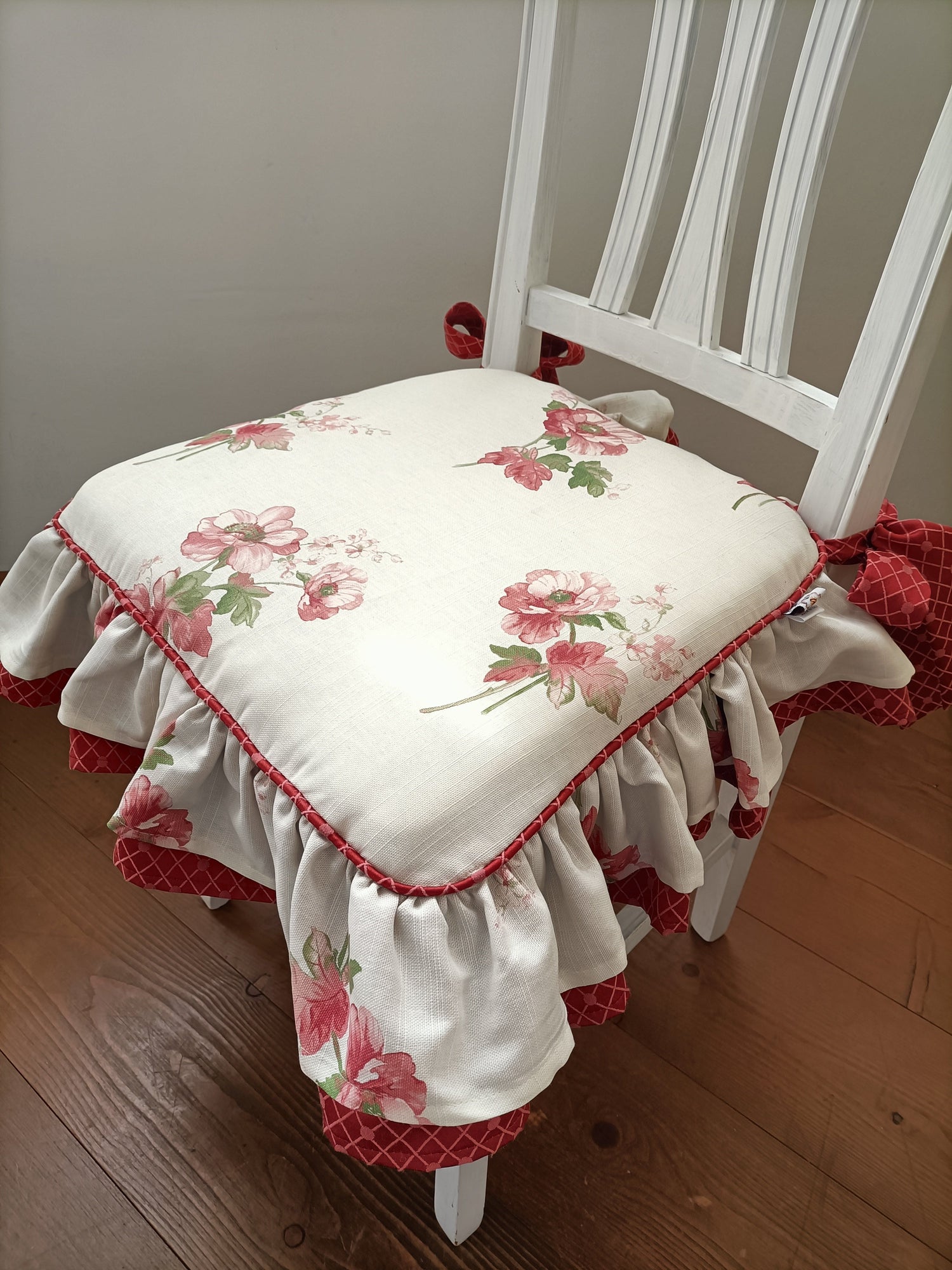 Cuscino per sedia sagomato, sfoderabile con doppia balza lavabile in acqua a 30 gradi. Imbottitura in gomma di poliuretano indeformabile. Tessuti esclusivi e di ottima qualità. Adatti ad uno stile shabby e country chic. Misura frontale cm 45 profondità cm 40 misura posteriore cm 39