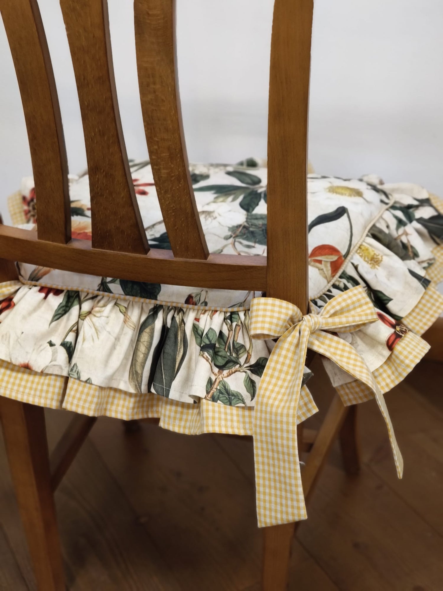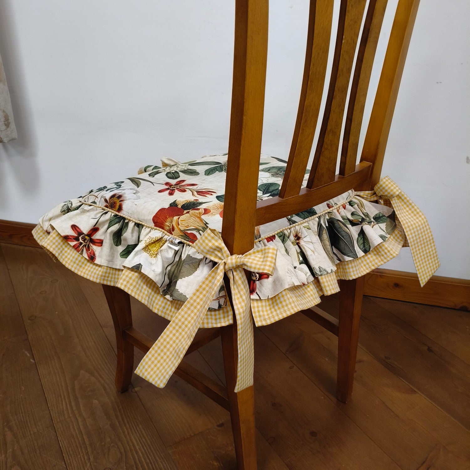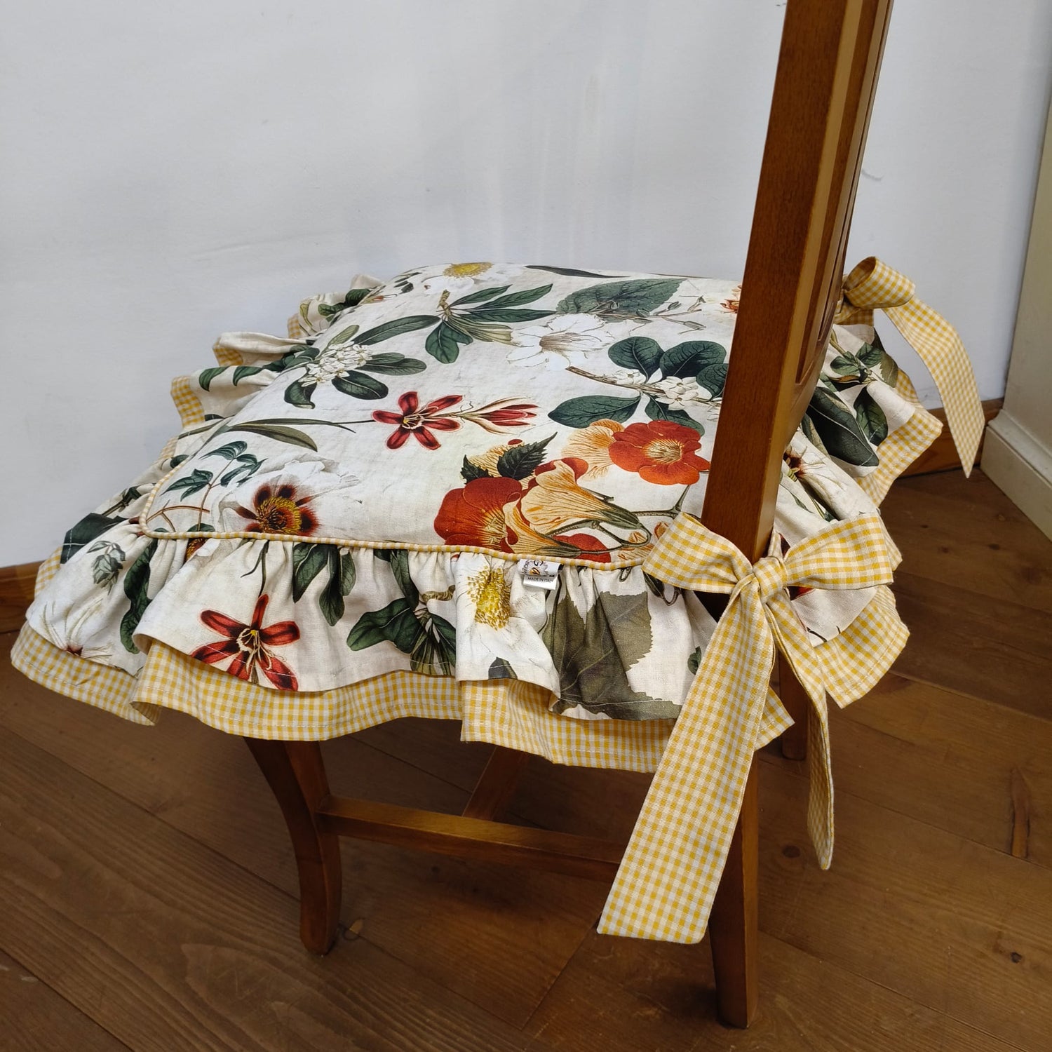 Cuscino per sedia sagomato sfoderabile, tessuto di cotone di ottima qualità lavabile in acqua. Stampa durevole nel tempo di gusto inglese. Adatto a sedie in legno di misure standard. Di gusto country, shabby chic. Arredato con stile cucina, zona pranzo o taverna.