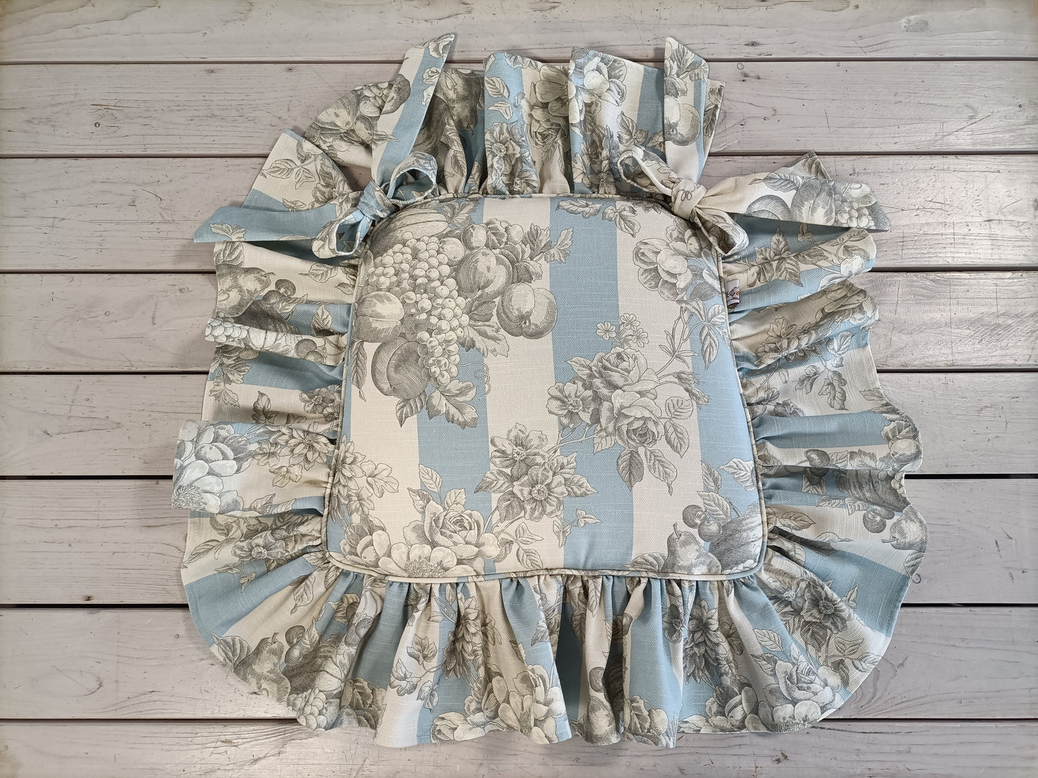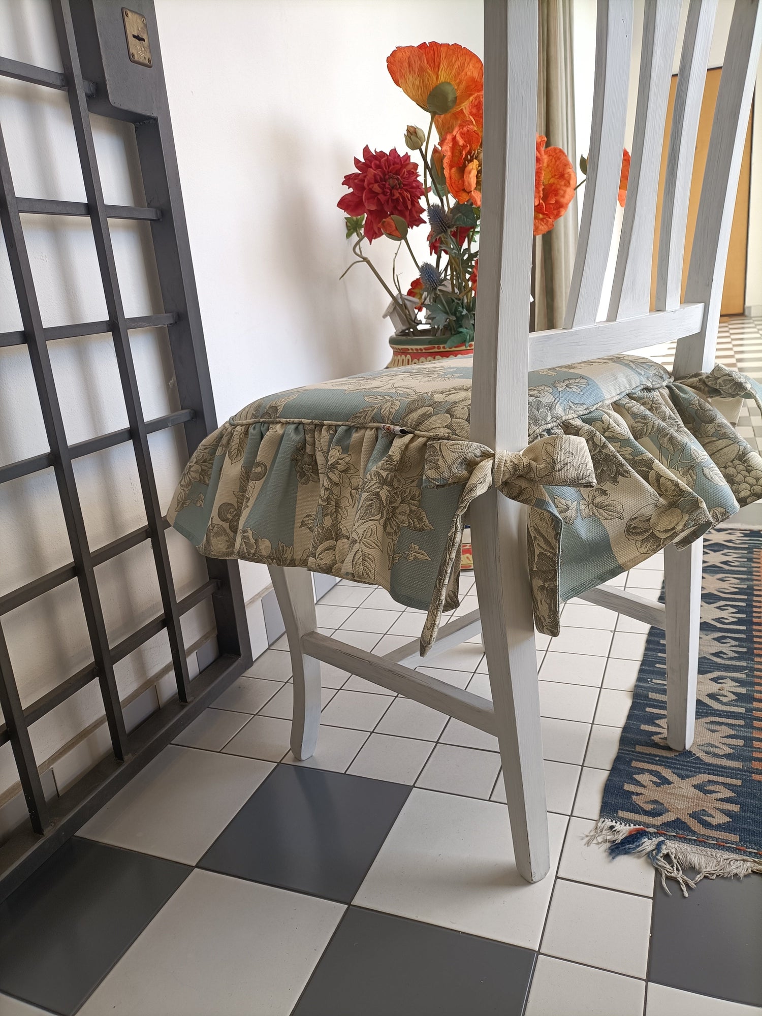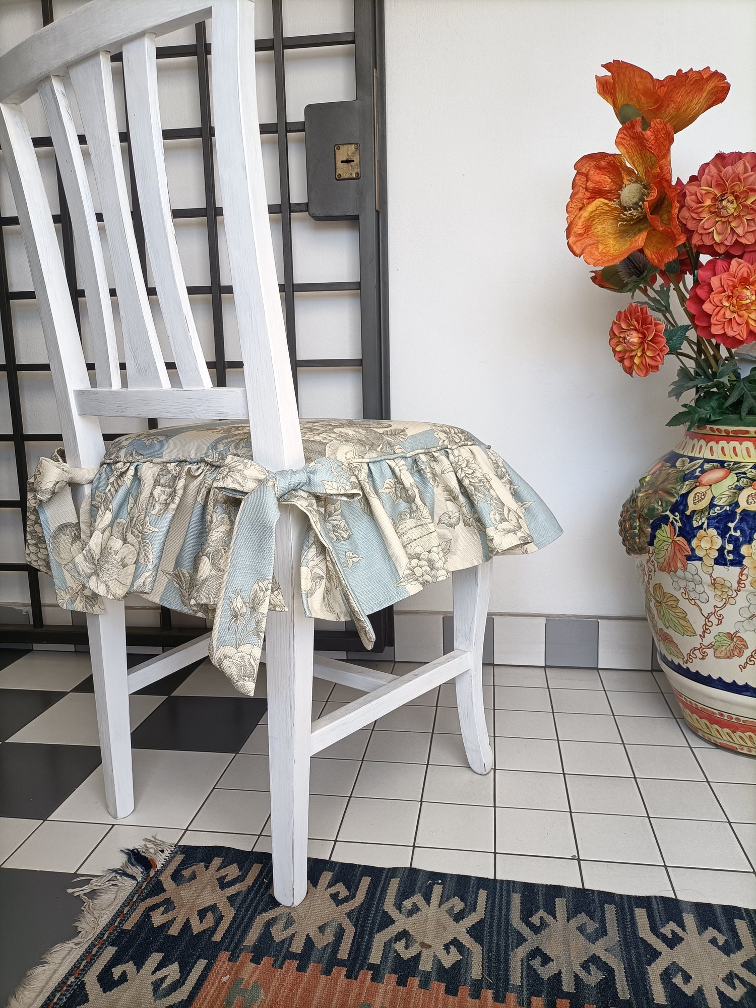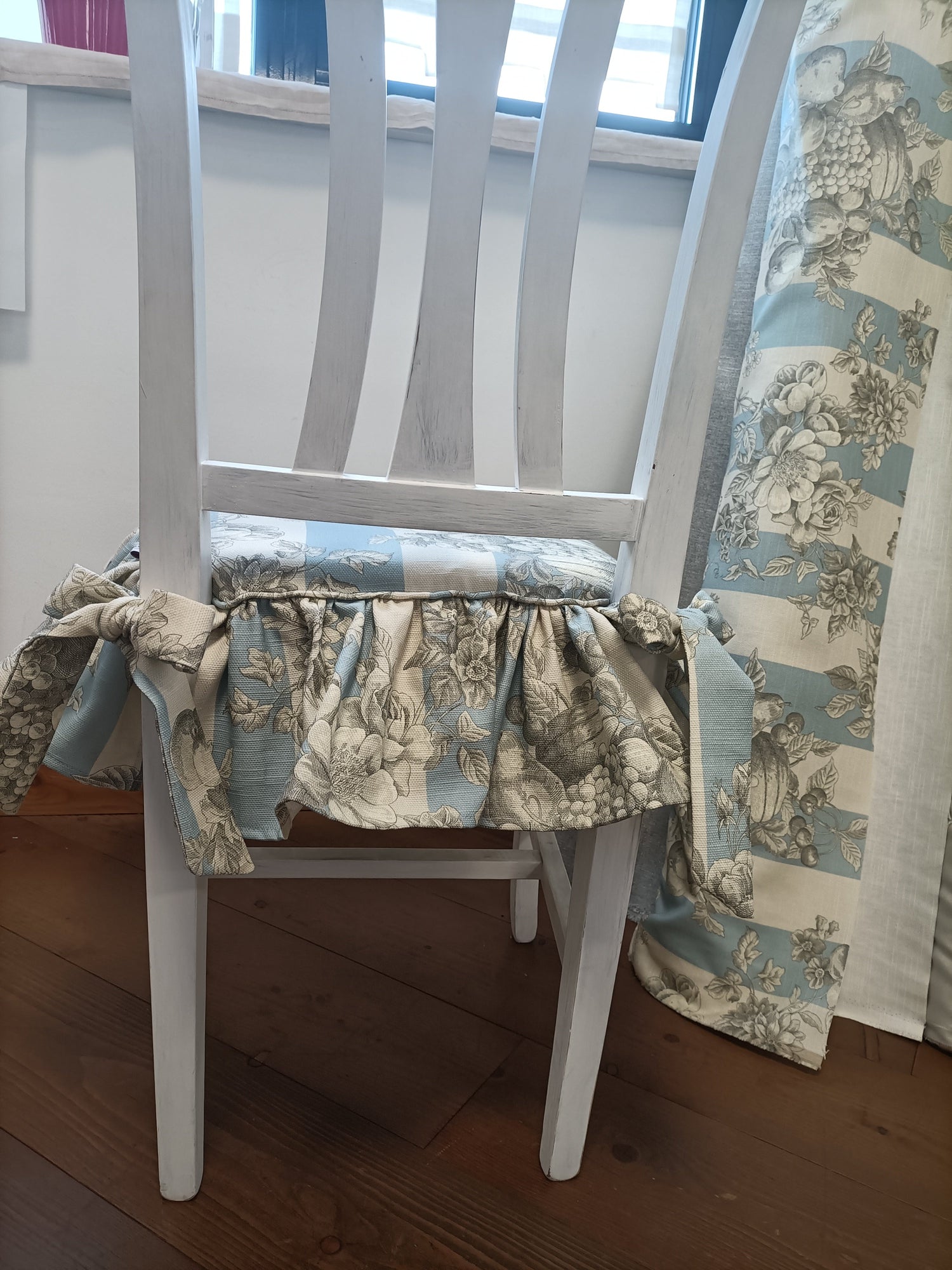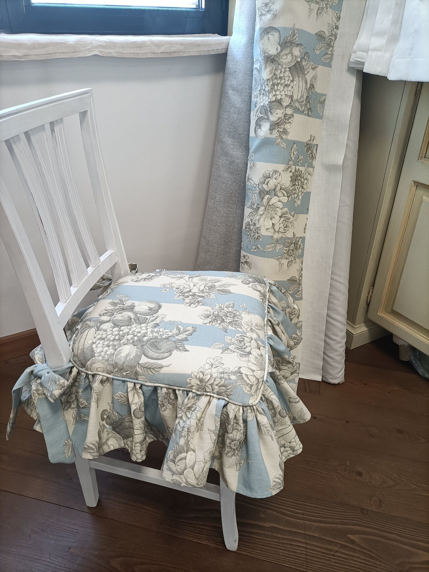 Cuscino per sedia sagomato, sfoderabile con una balza in tessuto di cotone stampato. Colore delicato e di grande effetto. Lacci lunghi per nodo con fiocco. Adatto ad un arredo elegante e raffinato. Fresco e giovane per dare una nota di personalità all'ambiente.